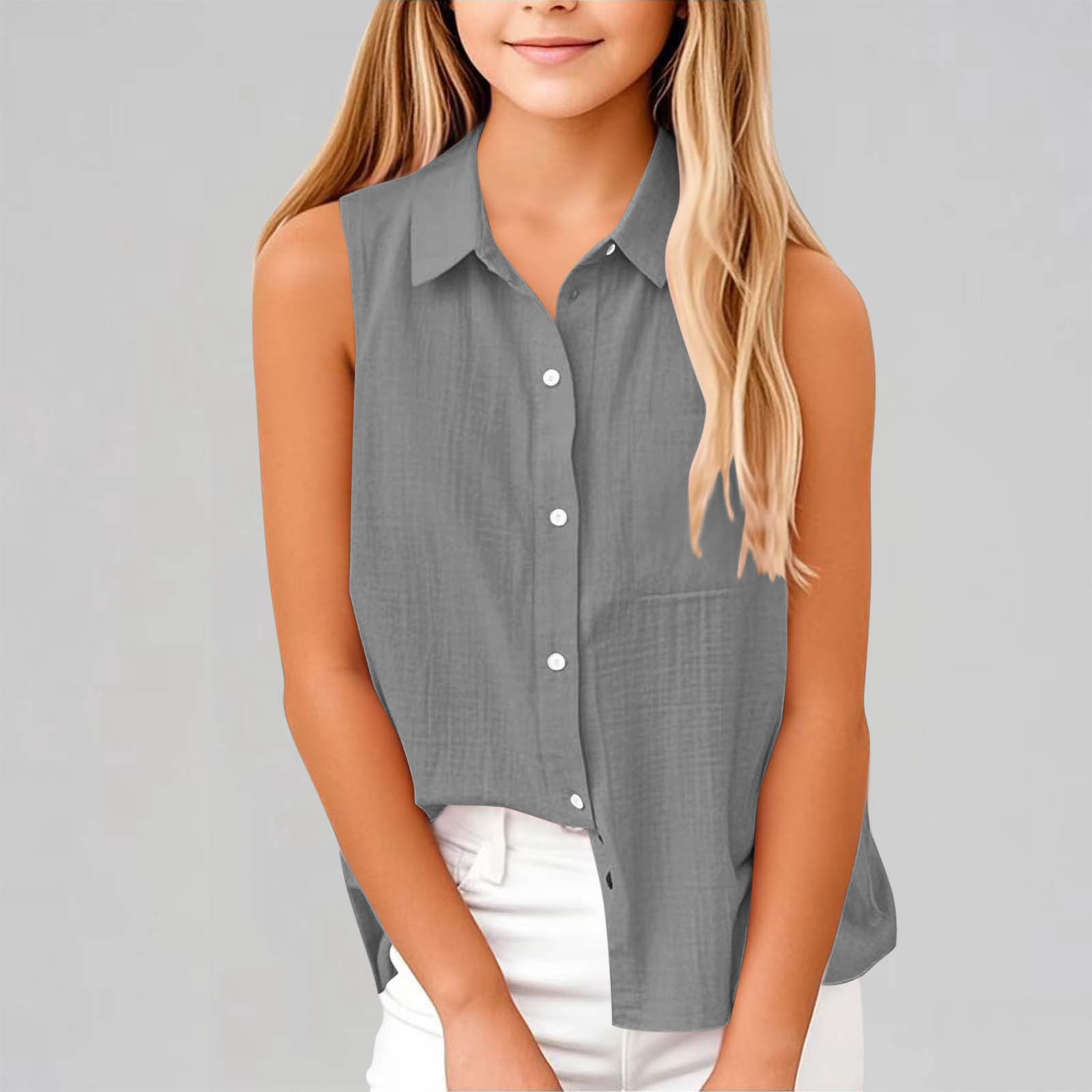 Hero image 0 of Mwjwdo Deals Girls Cotton Linen Shirt Sleeveless Button Up Lapel Collar Solid Color Tank Tops Fashion Casual Boho Vacation Tshirts Gray 5 Years, 0 of 7
