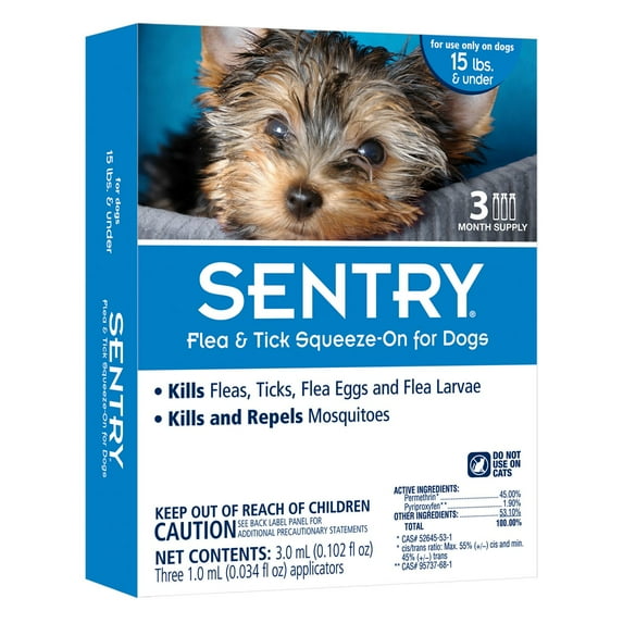 Sentry Squeeze On Flea Tick Control for Dogs Sentry Squeeze-On Flea Tick Control for Dogs kills over 92% of adult fleas and ticks within 24 hours. One dose also kills fleas, ticks, flea eggs and flea larvae for up to four weeks. Additionally, Sentry kills and repels pesky mosquitos. For dogs and puppies 3 months of age and older. Features: 3 month supply Kills fleas and ticks within 24 hours Repels mosquitos Continues to kill eggs and larvae for 4 weeks Item Specifications: Sizes: Small-for dogs up to 15lbs Medium-for dogs 15-33lbs Large-for dogs 33-66lbs X-Large-for dogs over 66lbs Ingredients: Permethrin-45% Pyripoxyfen-1.9% Caution: D o not use on or near cats.