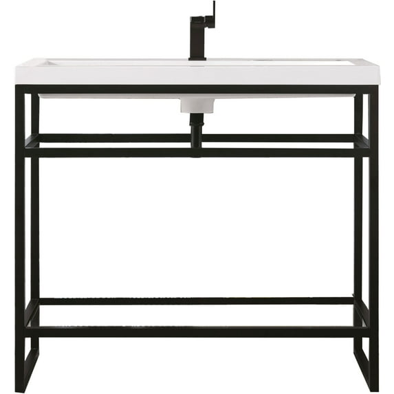 The Boston 39.5-in Stainless Steel Console by James Martin Vanities will add a sleek, bold look to any bathroom. This metal framed console is crafted with a durable stainless-steel base with a matte black finish giving you the clean lines and an open view that will work well with a variety of different decors. This versatile cabinet comes with a white glossy composite top with an integrated sink for a modern clean look that is predrilled for your convenience for a single hole faucet (not included with purchase). The lower shelf area provides generous storage for towels and toiletries.