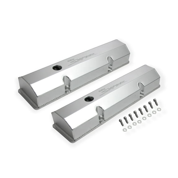 Sniper's fabricated aluminum valve covers give you an excellent way to add a high-end fabricated look without the high-end price. They offer you a lightweight and tough valve cover for your favorite street, off-road, or racing machine. These valve covers are constructed of 6061 T5 sheet aluminum, precision TIG welded for a proper fit, and feature a laser etched "Sniper" logo on top. They are available in silver anodized or black coated finishes along with various heights to clear most popular rocker arm combinations. All of Holley's valve covers include mounting hardware for quick and simple installation.
