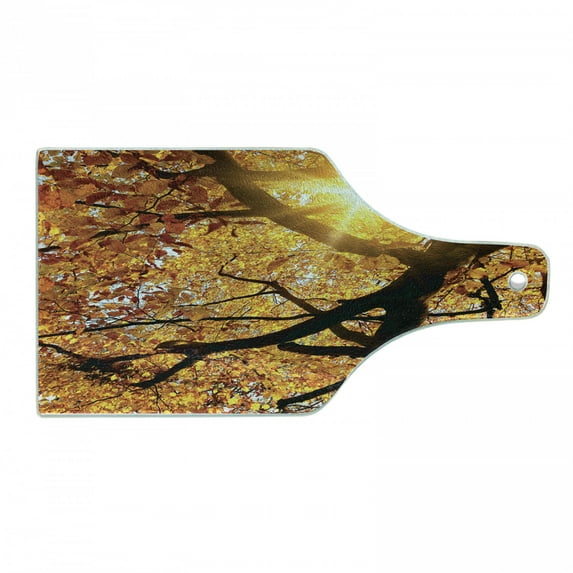 Hero image 0 of Nature Cutting Board, Sun Through Leaf Golden Yellow Vivid October Foliage Harvest Serene Paradise Photo Art, Tempered Glass Cutting and Serving Board, Wine Bottle Shape, Orange, by Ambesonne, 0 of 1
