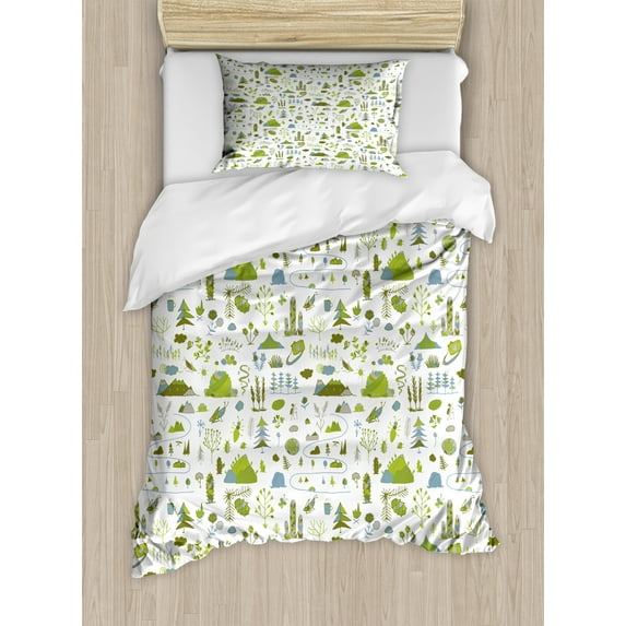 Hero image 0 of Nature Duvet Cover Set, Wild Field Hiking Along Rocks Mountain Pine Trees Insects Valley Rural, Decorative 2 Piece Bedding Set with 1 Pillow Shams, Twin Size, Lime Green and Ceil Blue, by Ambesonne, 0 of 3
