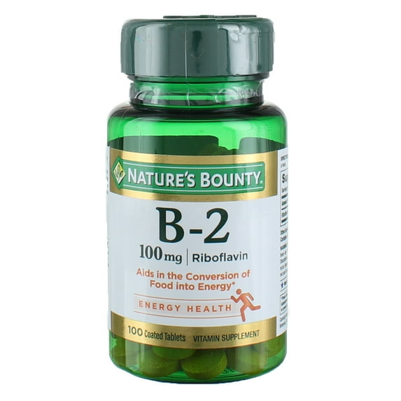 Nature's Bounty Vitamin B-2, also known as Riboflavin, aids in the metabolism of carbohydrates, proteins, and fats to support energy metabolism for the body. As part of the Vitamin B family, B-2 also helps support a healthy nervous system. Nature's Bounty Vitamin B-2 100mg Tablets aid in the conversion of food into energy, are Non-GMO and gluten-free Nature's Bounty B2 Riboflavin Coated Vitamin Tablets, 100 Mg, 100 Ct - Nature's Bounty B-2 Riboflavin aids in the Conversion of Food into Energy- Suitable for Vegetarians- Non-GMO, Gluten Free- These tablets contain no preservatives- These statements have not been evaluated by the Food and Drug Administration. This product is not intended to diagnose, treat, cure or prevent any disease Ingredients Dicalcium Phosphate, Vegetable Cellulose. Contains <2% of: Silica, Vegetable Magnesium Stearate Suggested Use For adults, take one (1) tablet daily, preferably with a meal Warnings If you are pregnant, nursing or taking any medications, consult your doctor before use. Discontinue use and consult your doctor if any adverse reactions occur. Keep out of reach of children. Store in a cool, dry place. Do not use if seal under cap is broken or missing DisclaimerThe product Description s and instructions provided by vitabox.com are for informational purposes only and are qualified in their entirety by the information available from manufacturers of the products. You should carefully read all product packaging, and contact the manufacturer with any questions before using a product. While we endeavor to ensure that product Description s are current, manufacturers sometimes change their products. We are not liable for inaccuracies or misstatements about products. We do not provide medical advice or recommendations. You should not use the information provided by vitabox.com for diagnosing or treating a health problem or disease. If you have or suspect that you have a medical problem, immediately contact your health care provider. Information and statements regarding dietary supplements have not been evaluated by the Food and Drug Administration or any other government agency and are not intended to diagnose, treat, cure, or prevent any disease.