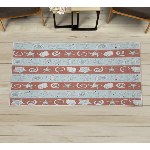 Nautical Decorative Rug, Marine Theme Sea Animals Fishes Shells on Striped Blue Background, Quality Carpet for Bedroom Dorm and Living Room, 6 Sizes, Pale Cadet, by Ambesonne