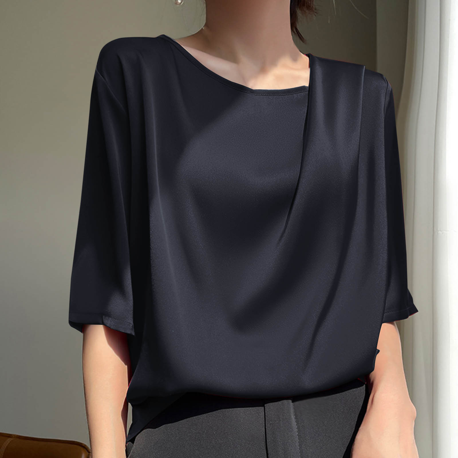 Hero image 0 of New Summer Arrivals Olyvenn Summer Tops for Women Satin Shirts Boat Neck Short Sleeve Blouses Lightweight Simple Daily Tshirts Loose Basic Tees Black XL, 0 of 3