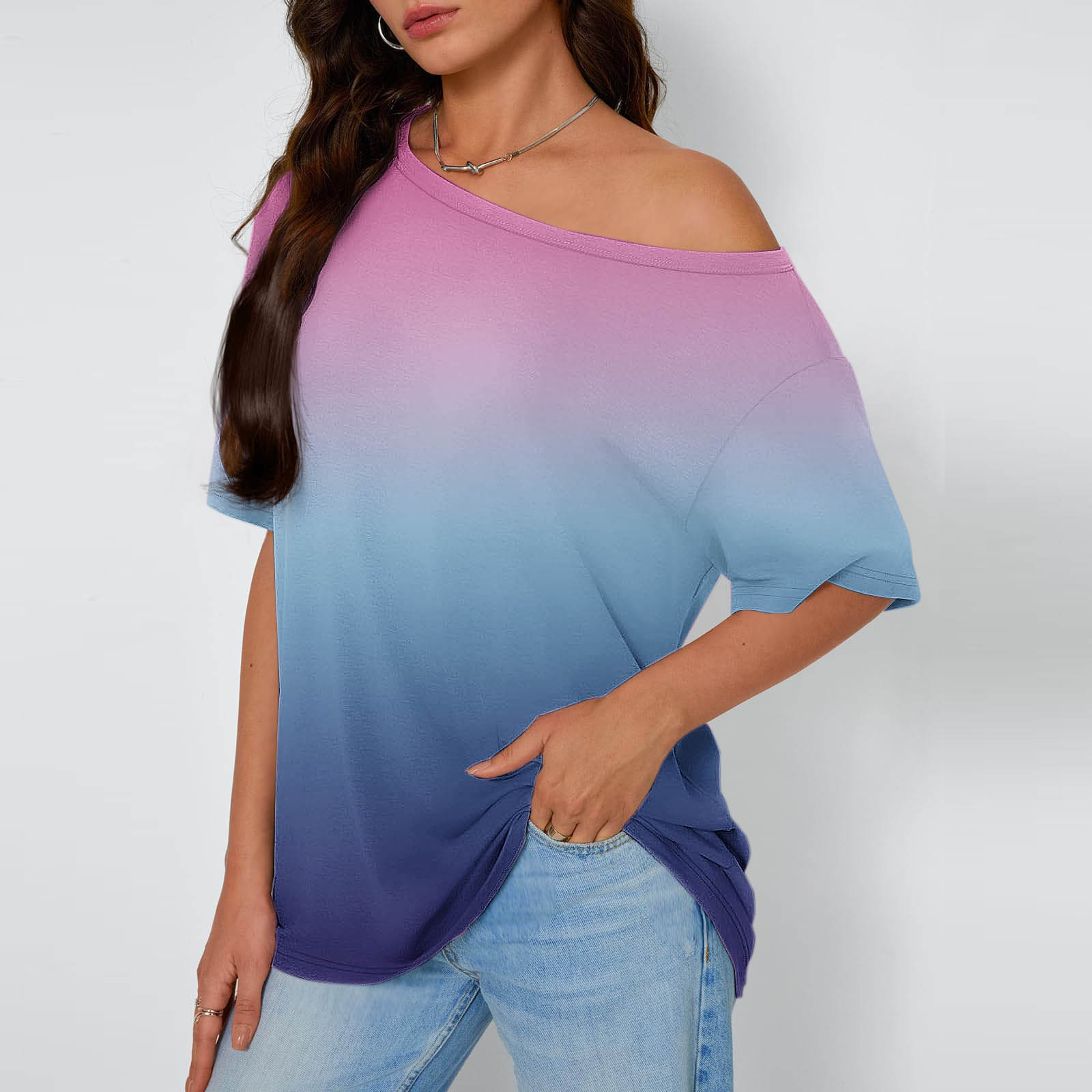 New Summer Arrivals Olyvenn Womens Summer Tops Gradient Printed Short Sleeve Top Cold Shoulder Tunic T Shirt Casual Versatile Blouses Lounge Stylish Tops Pink M