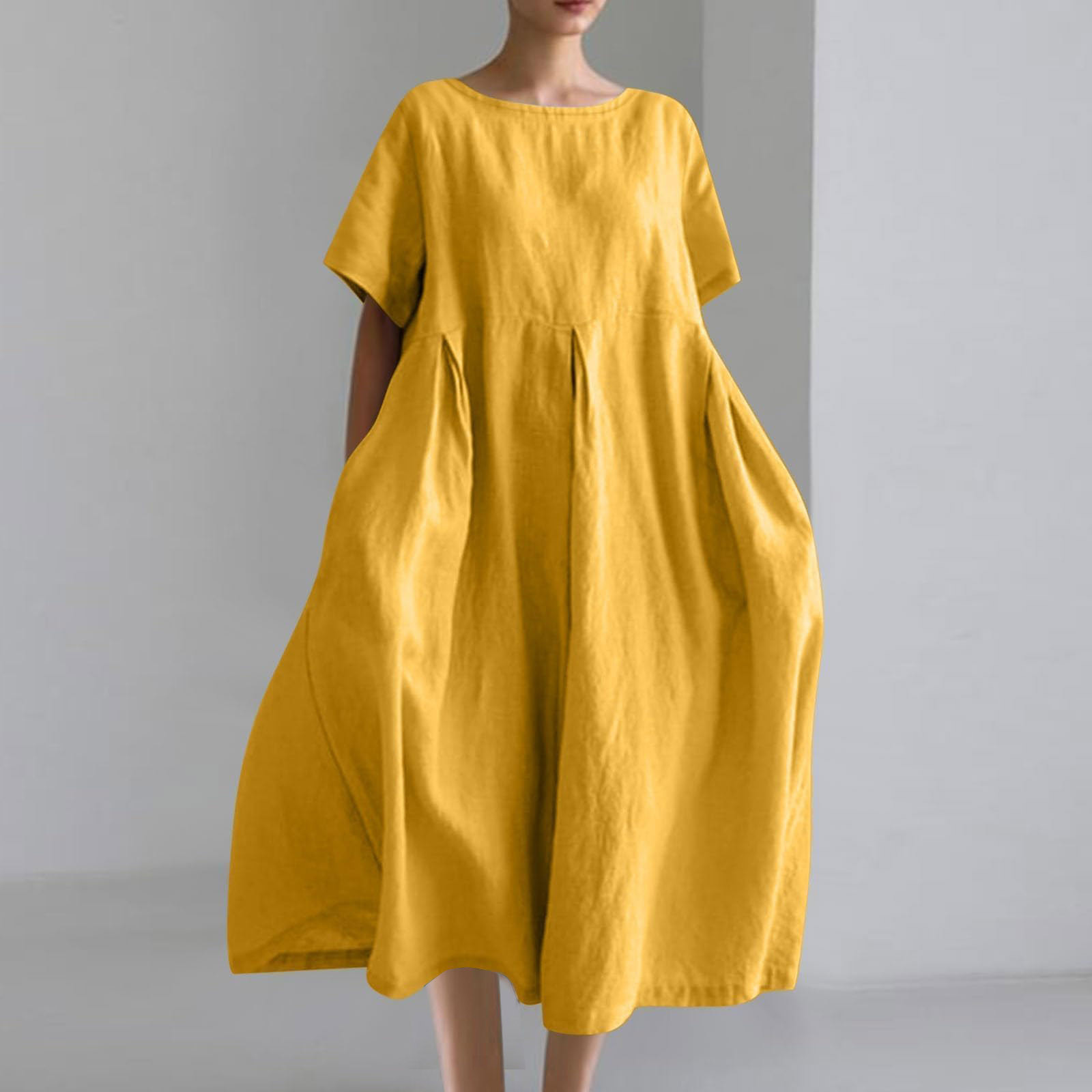 New Summer Arrivals SMihono Plus Size Flowy Casual Cotton Linen Dress for Women Crewneck Short Sleeve Summer Loose Maxi Dress with Pockets Yellow XXL