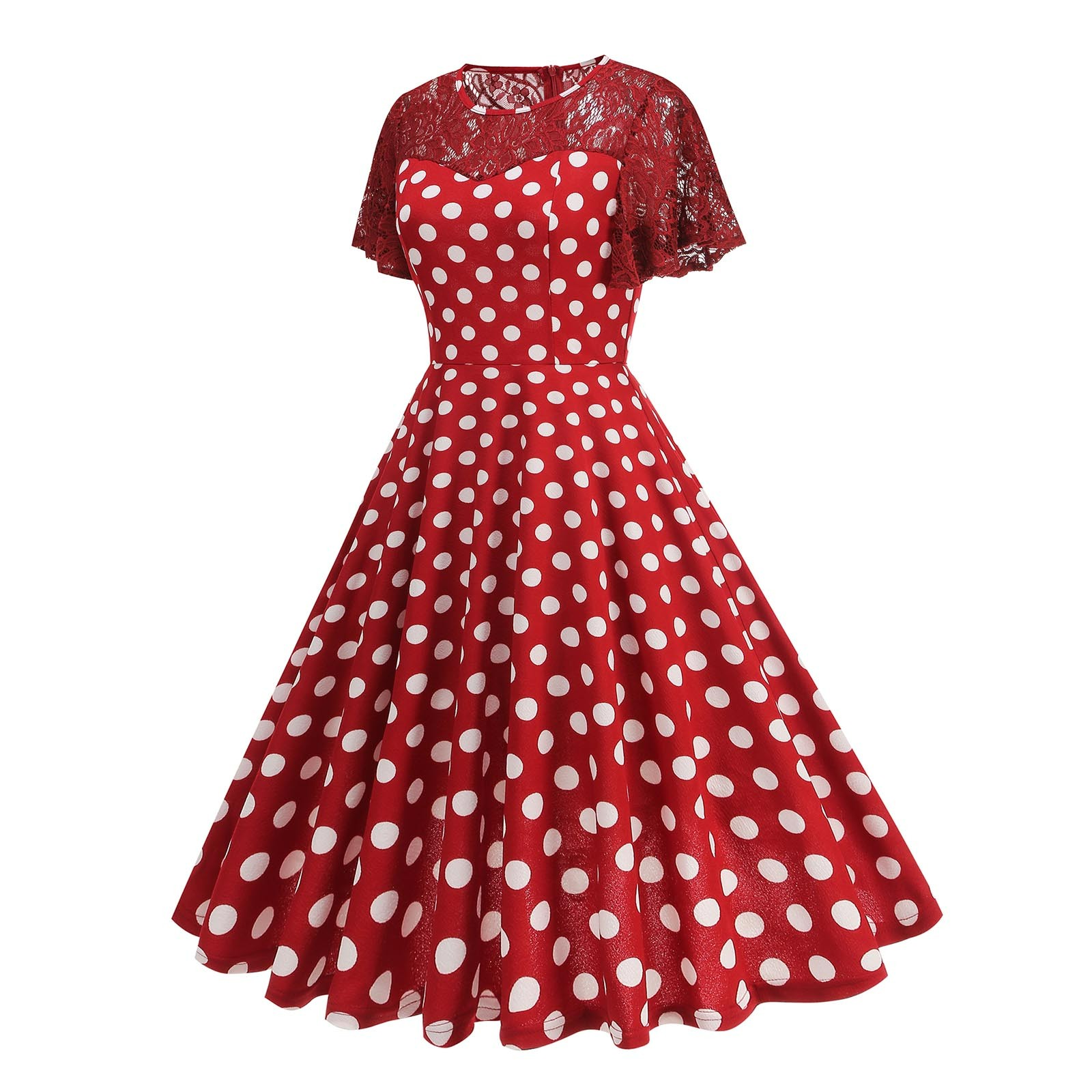 - New Summer Arrivals SMihono Women's Vintage Polka Point Cocktail Dress Trendy Hepburn Style Lace Short Sleeve Pleated A-Line Party Swing Dresses Red XXL