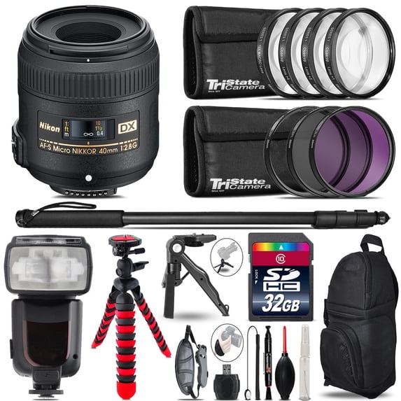 Nikon AFS 40mm 2.8 + Professional Flash + Macro Kit - 32GB Accessory Bundle (International Version)