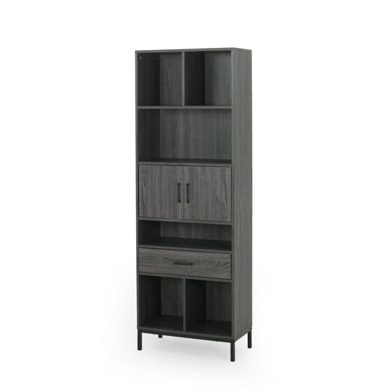 Do you love to organize your decor? Then our precisely structured bookcase is the ideal accessory for you. Featuring a clean contemporary design, our bookcase uses a compartmentalized design to create a geometric look for your home. This features two cabinets, one drawer, and multiple shelves which allow you to organize and display your items with a charming look. Finished with iron legs, this piece offers assuring stability and a sleek look, making this the perfect addition to any interior space.