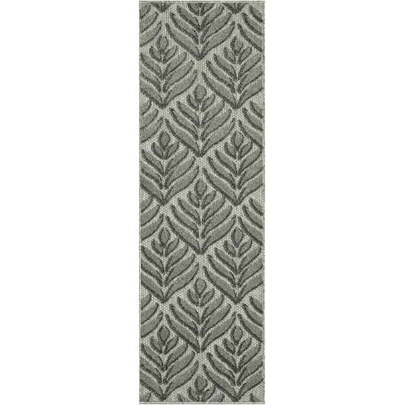 This sunny and sensational collection of flat-woven indoor/outdoor rugs is pretty, practical, and perfect for high-traffic areas. With its inviting assortment of classic and contemporary designs, tempting color palettes, and terrific textures, these multipurpose rugs will afford an air of simple sophistication to any environment. Tropical meets modern with this charcoal grey outdoor rug from the Aloha Collection. The flatwoven design is adorned with a raised, repeat palm leaf pattern that adds a subtle layer of dimension. Presented in calming colors, this botanical rug beautifully complements your patio, balcony, or deck. Made from durable polypropylene yarns that make it great for use in high-traffic indoor spaces as well, such as your kitchen, dining room, and living room.