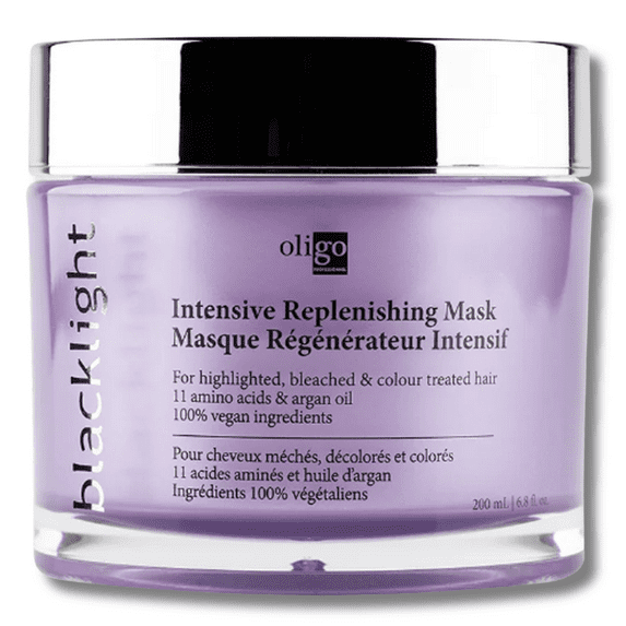 The Oligo Blacklight Intensive Replenishing Hair Mask is a deeply nourishing treatment designed to revitalize and protect color-treated hair. Enriched with 11 amino acids and argan oil, this 6.8 oz mask helps replenish moisture, restore vitality, and enhance shine. Suitable for all hair types, it strengthens and protects against further damage, leaving hair soft, smooth, and manageable. This luxurious and revitalizing hair care experience is formulated with 100% vegan ingredients, ensuring a gentle and effective solution for dry, damaged, or color-treated hair.