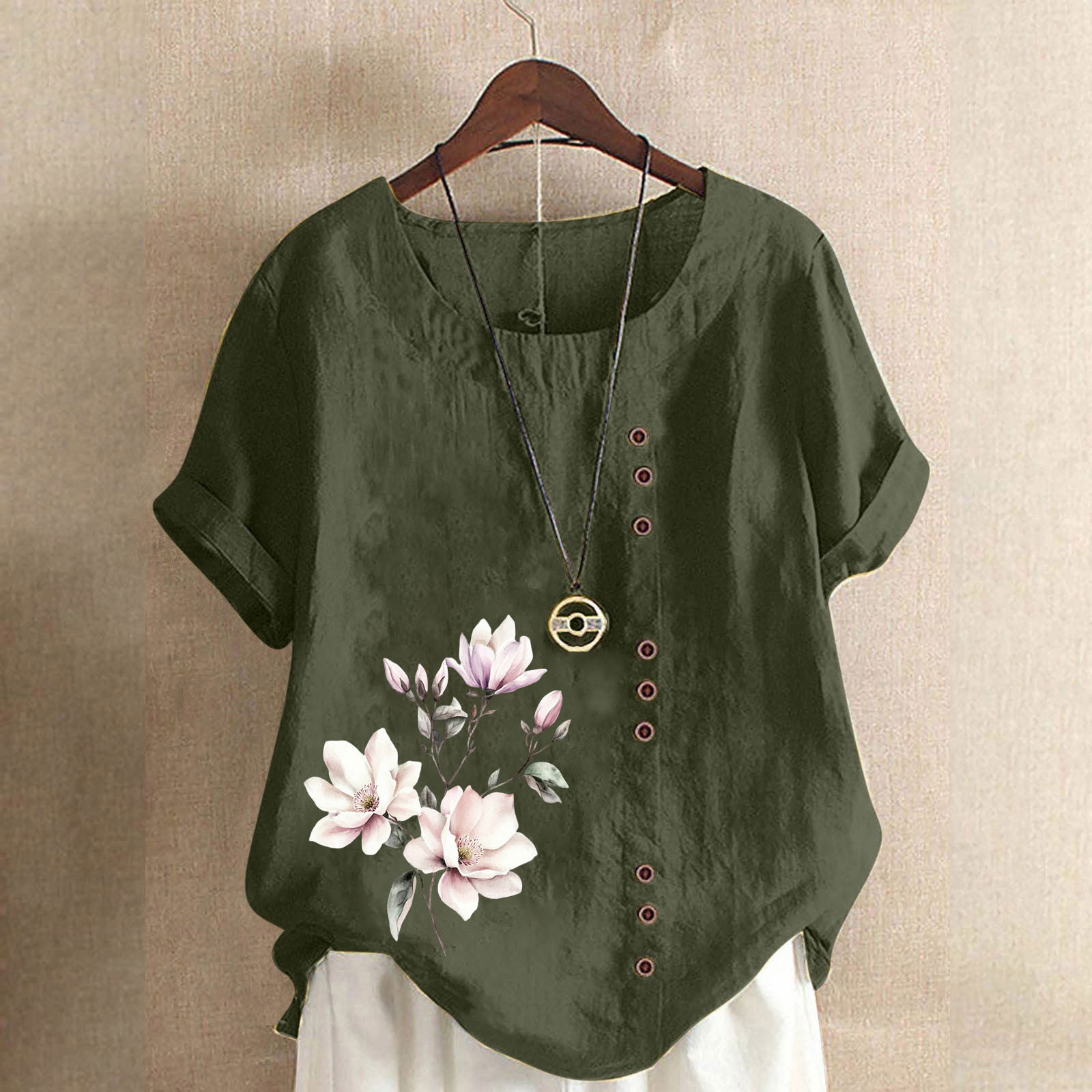 Hero image 0 of Olyvenn Cotton Linen Tops for Womens 2025 Crewneck Roll Up Short Sleeve Tshirt Trendy Floral Print Casual Loose Fitted Blouse Army Green XL, 0 of 4