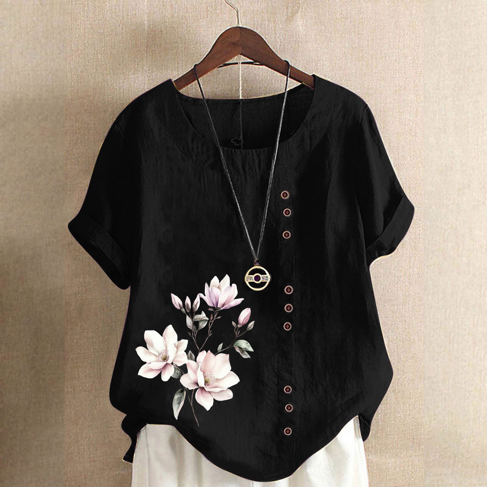 Olyvenn Cotton Linen Tops for Womens 2025 Crewneck Roll Up Short Sleeve Tshirt Trendy Floral Print Casual Loose Fitted Blouse Black S