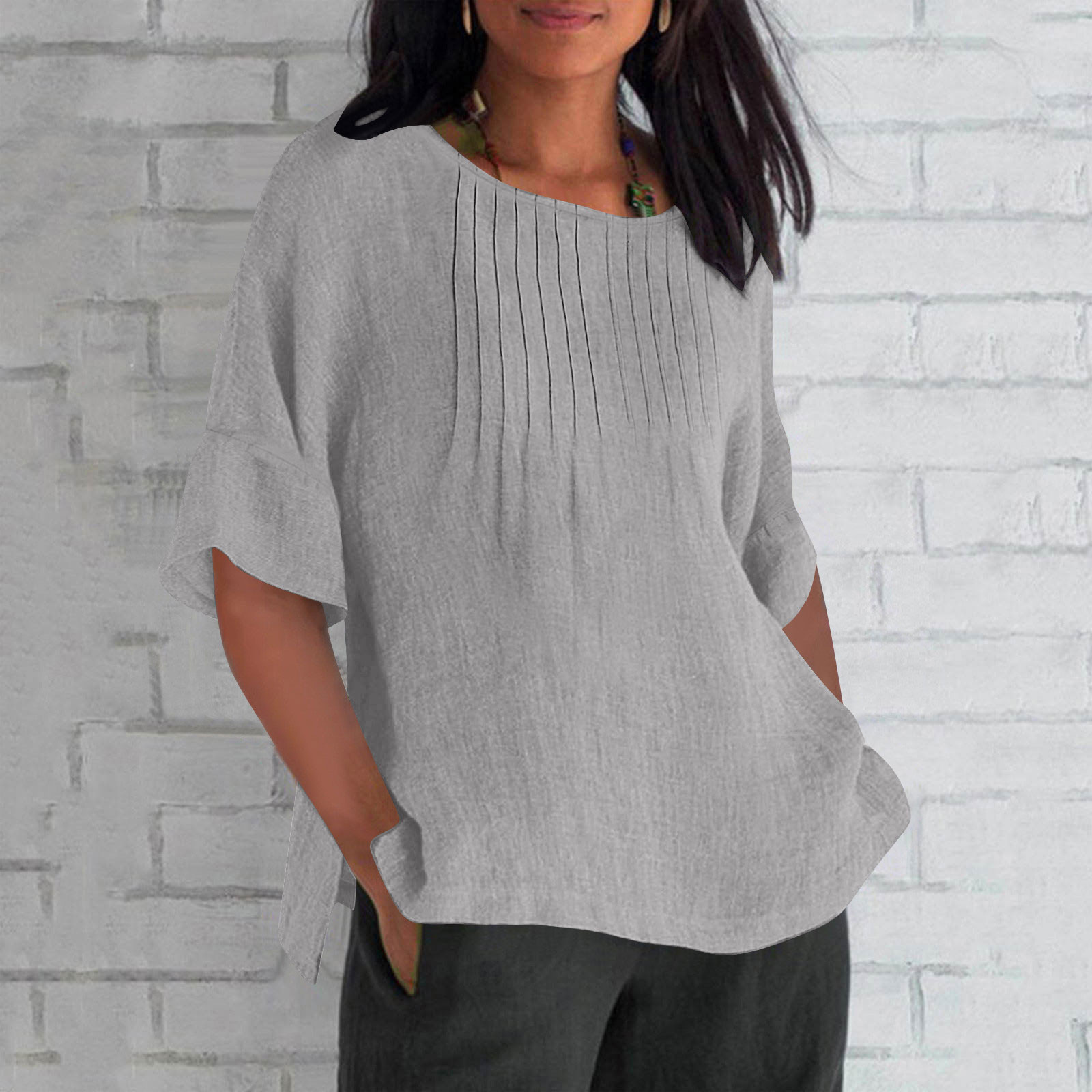 Olyvenn Stylish Linen Shirts for Women Basic Plus Size 3/4 Sleeve Tops Summer Casual Round Neck Pullover Blouse Ladies Tunic Tshirt Gray XXL