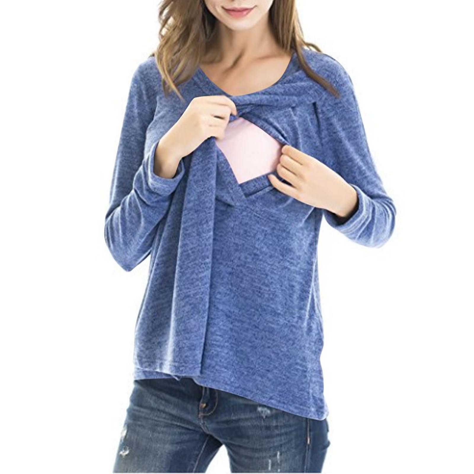 Olyvenn Stylish Women's Maternity Nursing Tops Solid Crew Neck Long Sleeve Tunic Blouse Casual Loose Fit Comfy Breastfeeding Blouse Blue 8