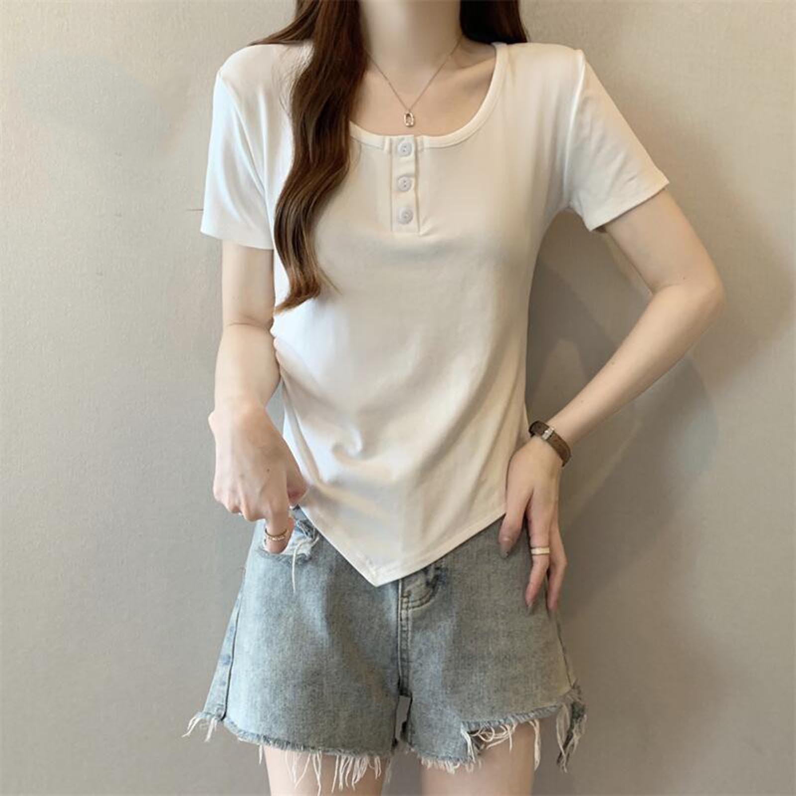 Olyvenn Stylish Womens Summer Irregular Hem Tops Casual Round Neck Short Sleeve Button Down Shirts Beach Vacation Trendy Y2k Clothes White L