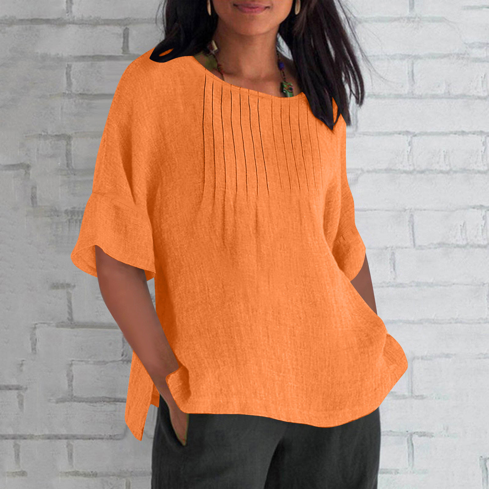 Hero image 0 of Olyvenn Linen Shirts for Women 2025 Basic Plus Size 3/4 Sleeve Tops Summer Casual Round Neck Pullover Blouse Ladies Tunic Tshirt Orange XL, 0 of 4
