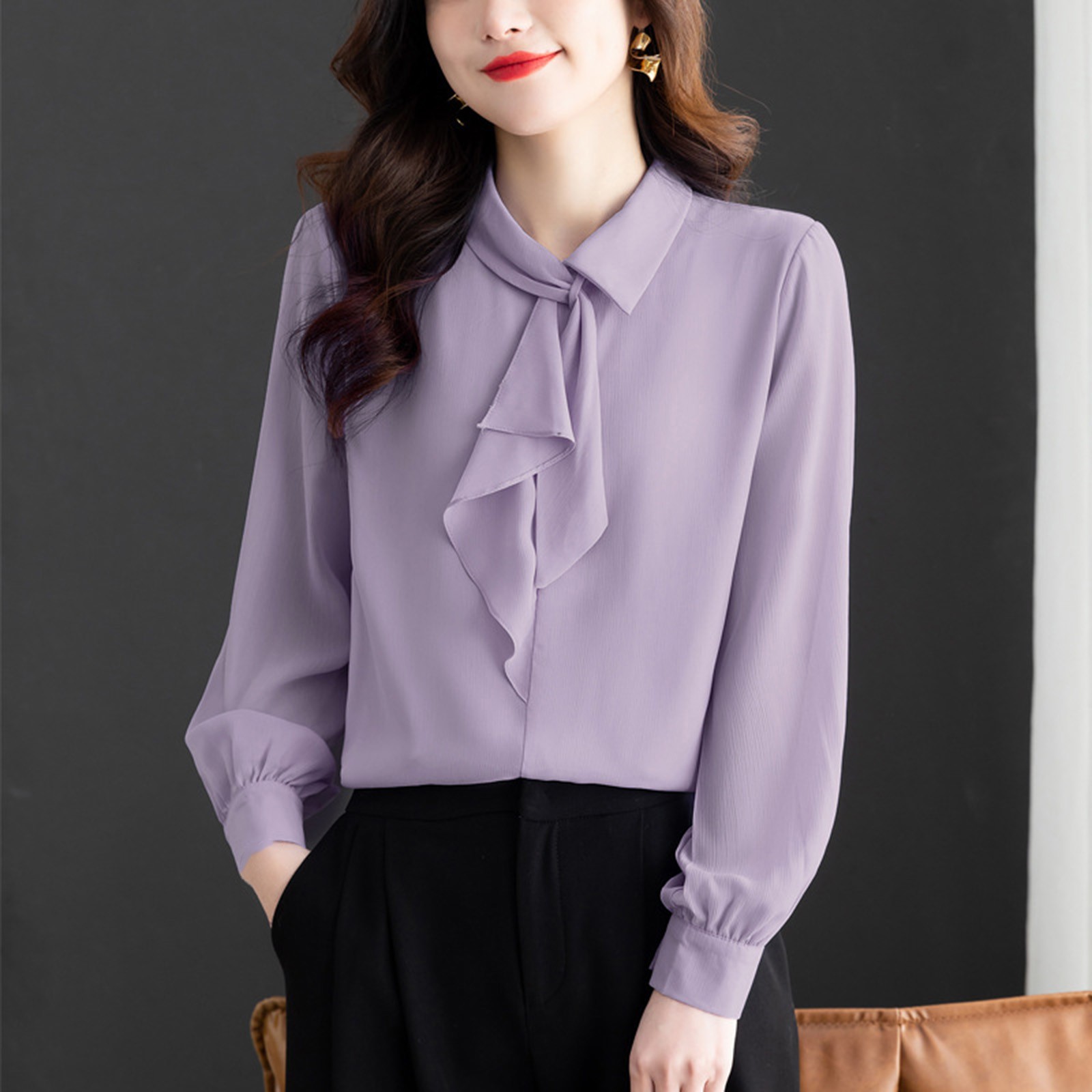 Hero image 0 of Olyvenn Fashion Women Bow Neck Chiffon Blouse Long Sleeve Chiffon Solid Tops Elegant Ladies Solid Color OL Style Tops Women Casual Shirts Purple XXXL, 0 of 6