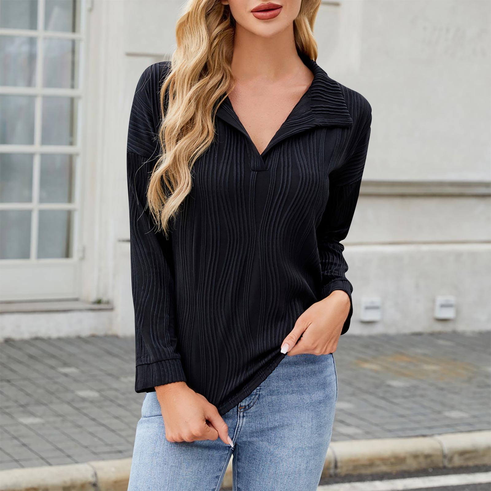 Olyvenn Fashion Women's Lapel V Neck Long Sleeve Shirts Fashion Blouse Textured Dressy Casual Pullover Sweater Tops Black S