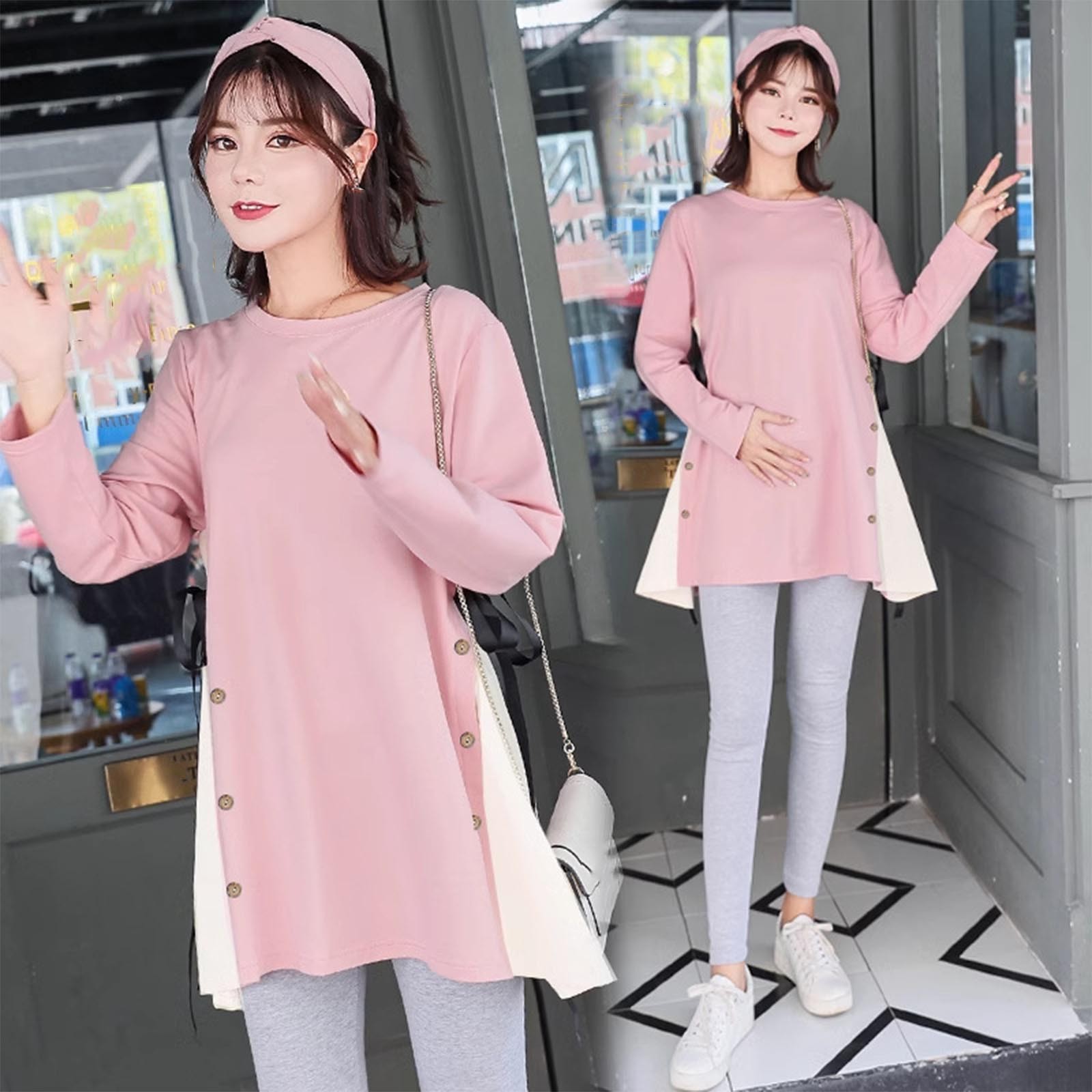 Olyvenn Fashion Women's Maternity Cotton Sweatshirts Maternity Soft Clothes Crew Neck Side Bow Button Design Shirts Pregnant Tops Pink 20-22