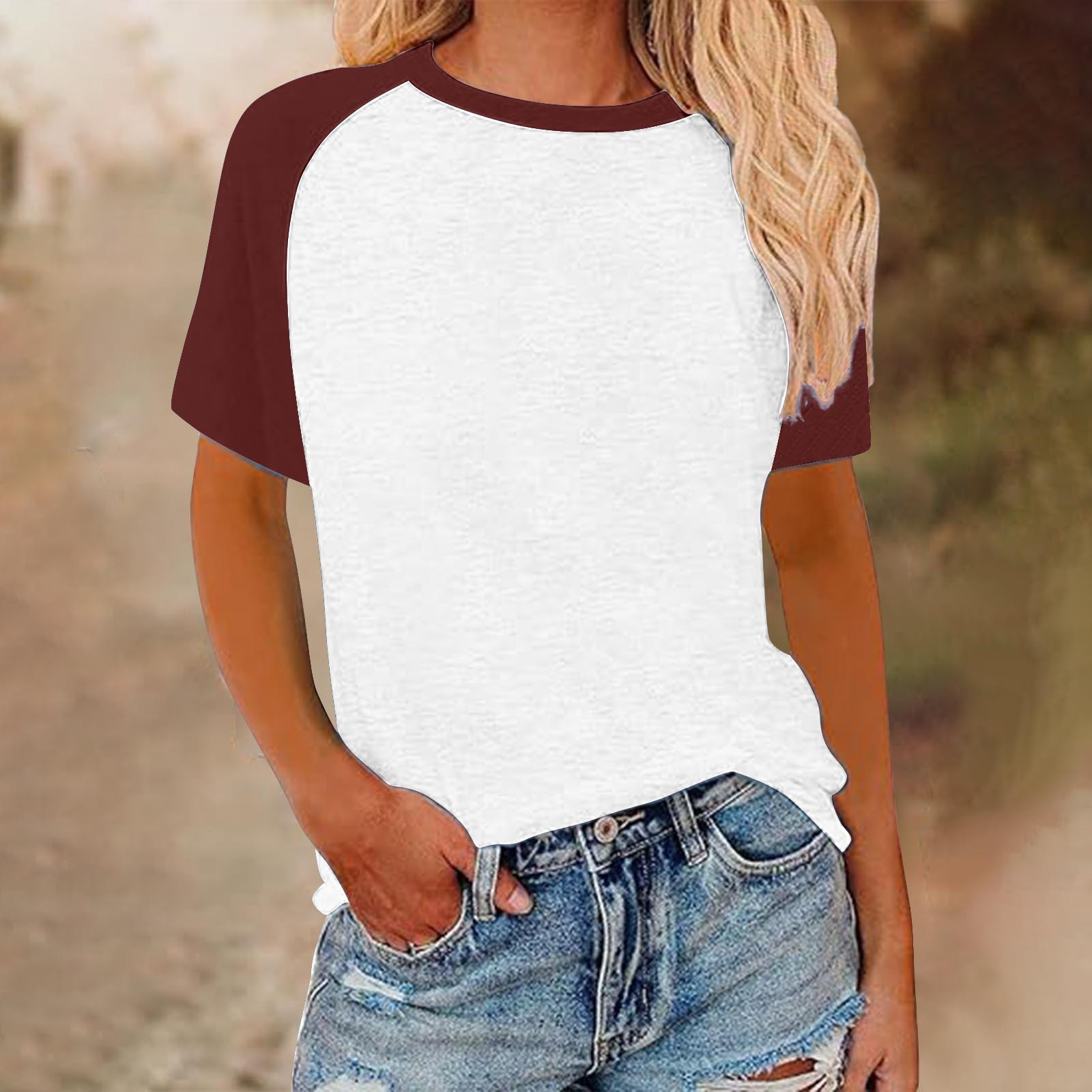 Olyvenn Splicing Tops for Women Short Sleeve Casual Cute Shirt Summer Cooling Blouses Tunic Workout Baseball Shirts Wine M