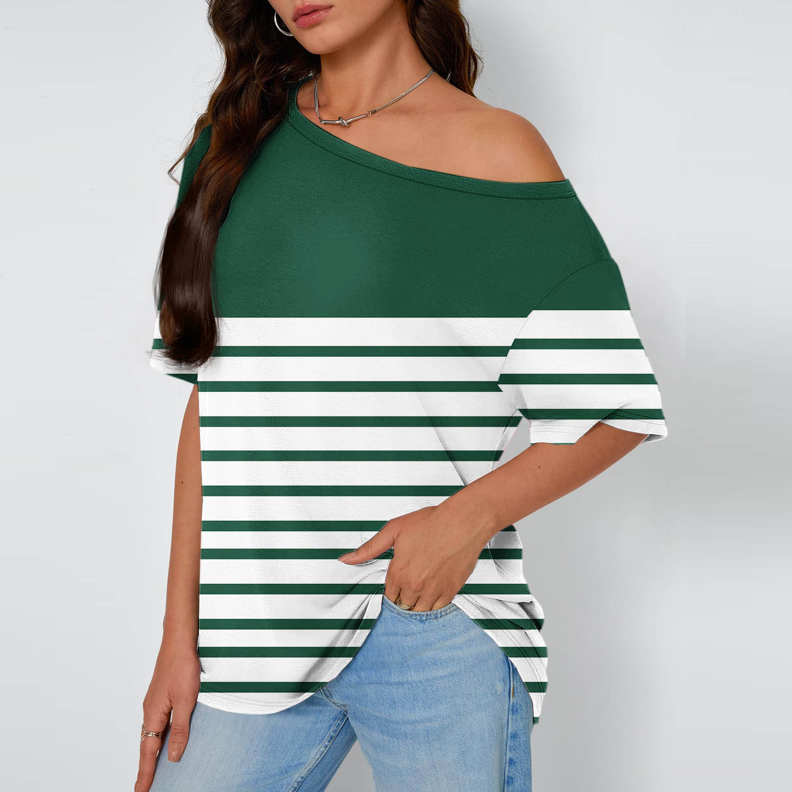 Hero image 0 of Olyvenn Summer Tops for Women 2025 Trendy Crew Neck Short Sleeve Blouses Loungewear Shirts Cold Shoulder Homewear Blouse Vacation Striped Clothes Green L, 0 of 6