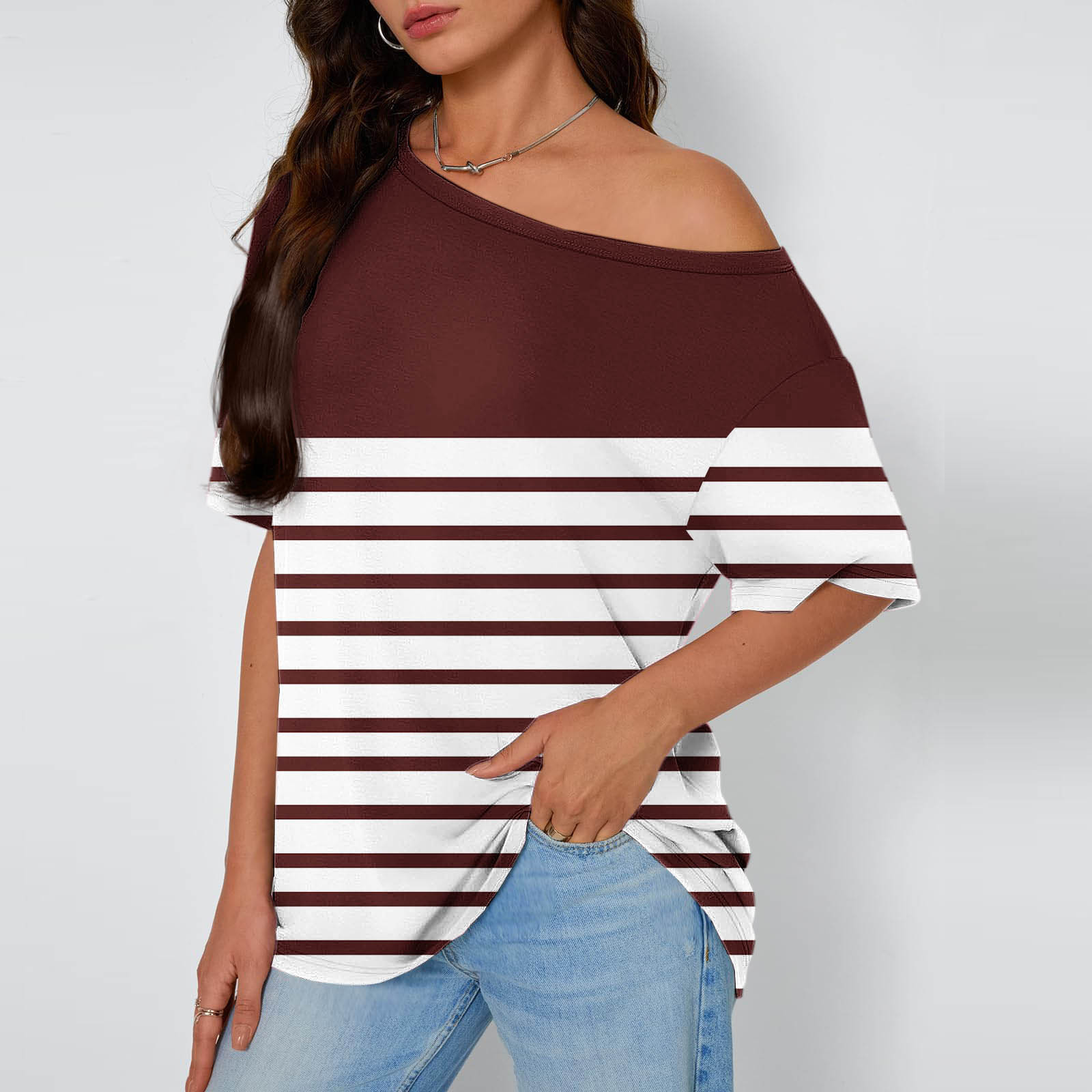 Olyvenn Summer Tops for Women 2025 Trendy Crew Neck Short Sleeve Blouses Loungewear Shirts Cold Shoulder Homewear Blouse Vacation Striped Clothes Wine L