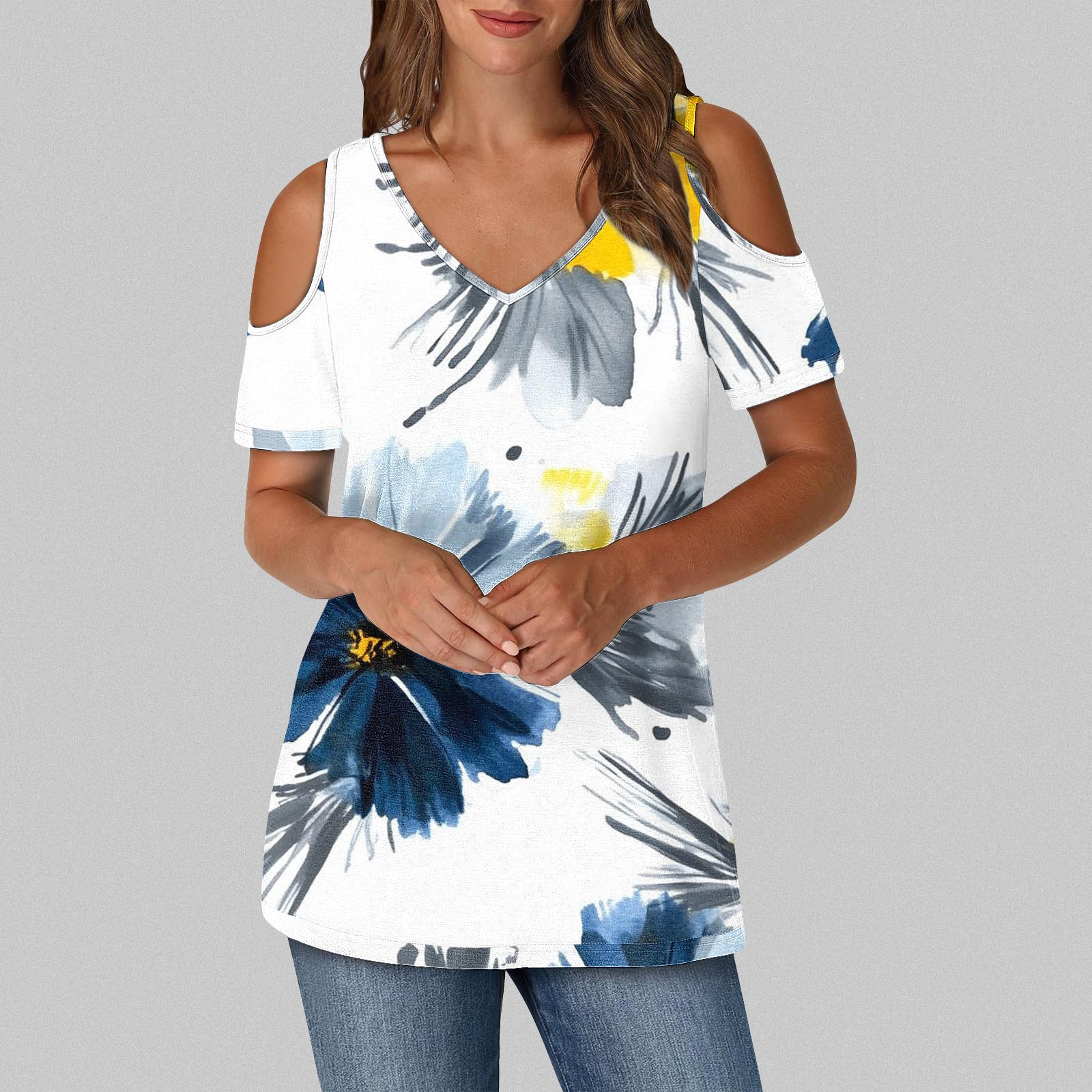 Olyvenn Women Cold Shoulder Tops Summer Short Sleeve Shirt Scoop Neck Tee Casual Loose Fitting Blouse Trendy Tee Shirt Navy L