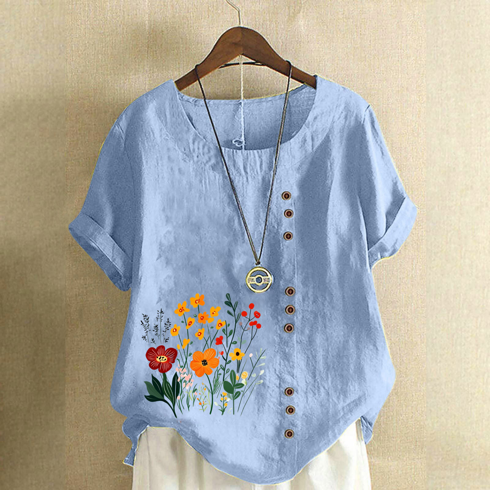 Hero image 0 of Olyvenn Women Floral Print Linen Shirts Short Sleeve Gauze Tops Loose Fit Cotton Blouses Trendy 2025 Clothing Light Blue XXXXXL, 0 of 4