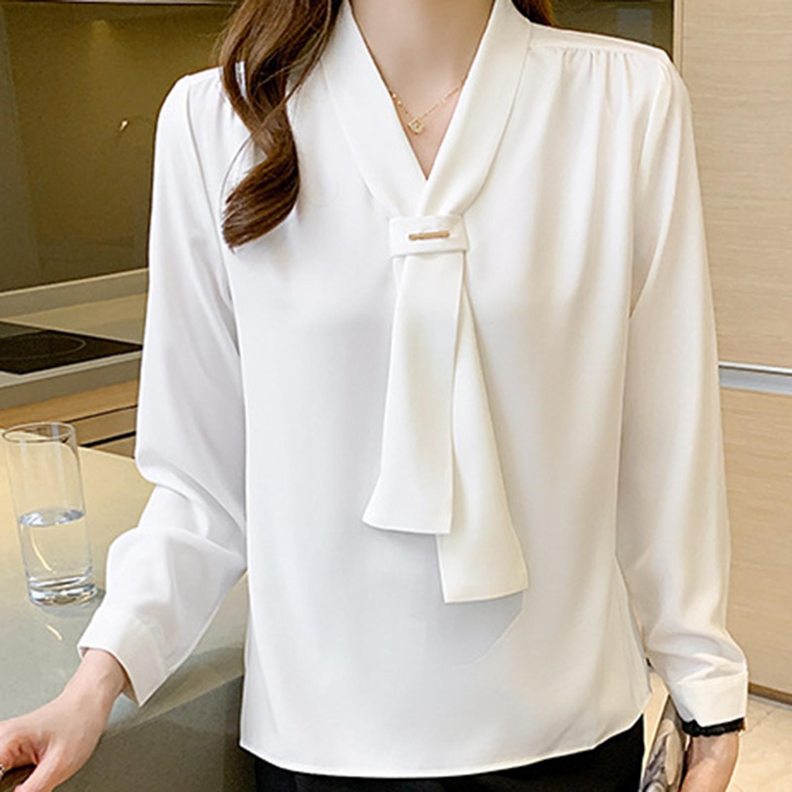 - Olyvenn Women's Bow Tie Neck White Chiffon Blouses Office Lady Long Sleeve V-Neck Casual Loose Business Shirt White M