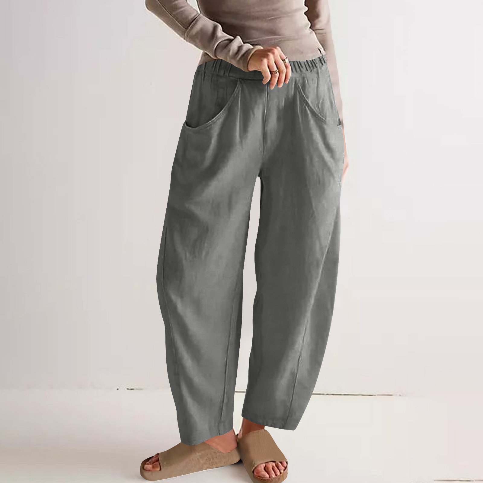 Olyvenn Women's Cotton Linen Harem Pants Work Casual Elastic Waist Pants with Pockets Lightweight Summer Beach Palazzo Gray M