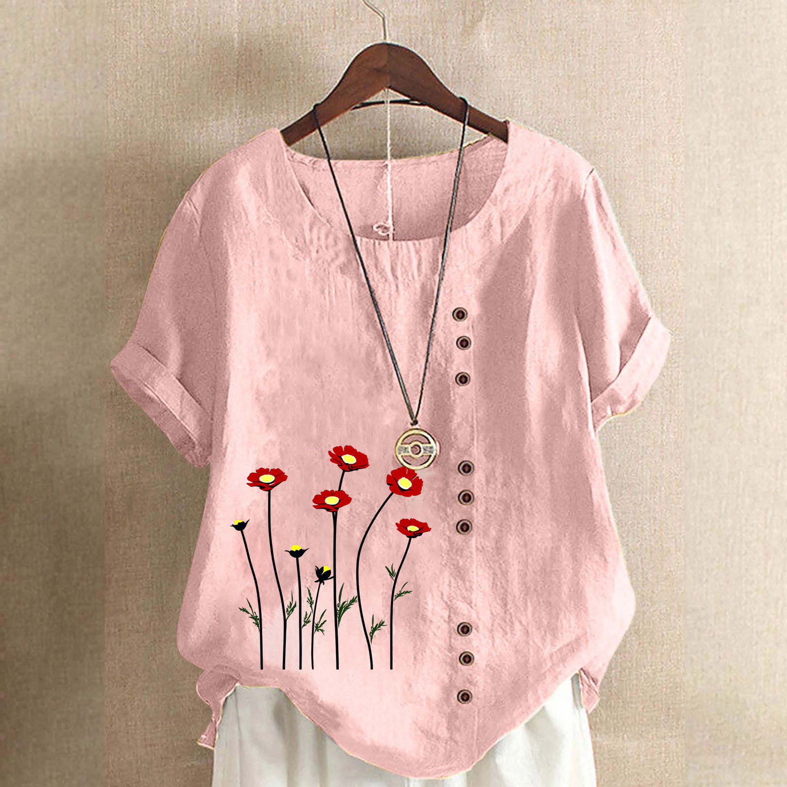 Olyvenn Women's Plus Size Linen Tops Short Sleeve Button Down Shirts Casual Summer Blouses Round Neck Tunic Tops Resort Wear Pink L