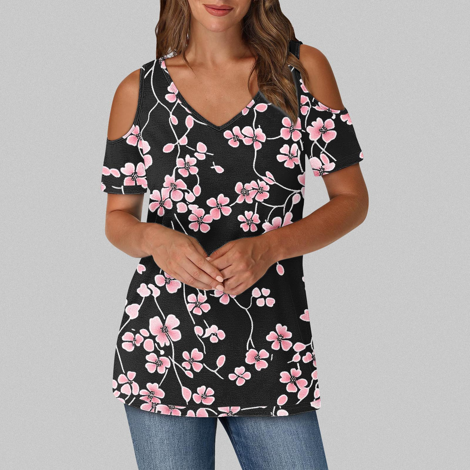 Olyvenn Women's Short Sleeve Shirts Floral Print Cold Shoulder Tops Basic Tees V Neck Blouse Fashion Summer Tshirts Multicolor S