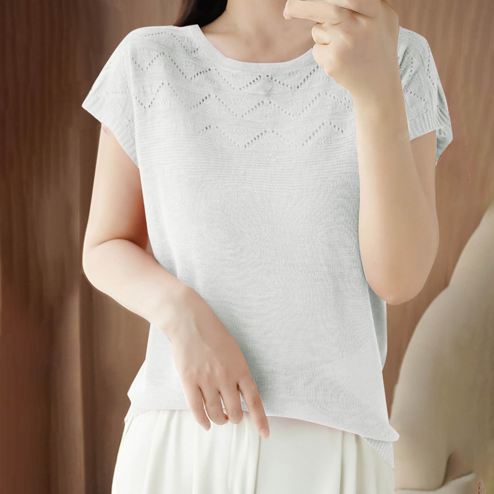 Hero image 0 of Olyvenn Women's T-Shirt Eyelet Knitwear Casual Solid Color Ladies' Tops Loose Round Neck Blouse Pullover Hollow Tees White M, 0 of 3
