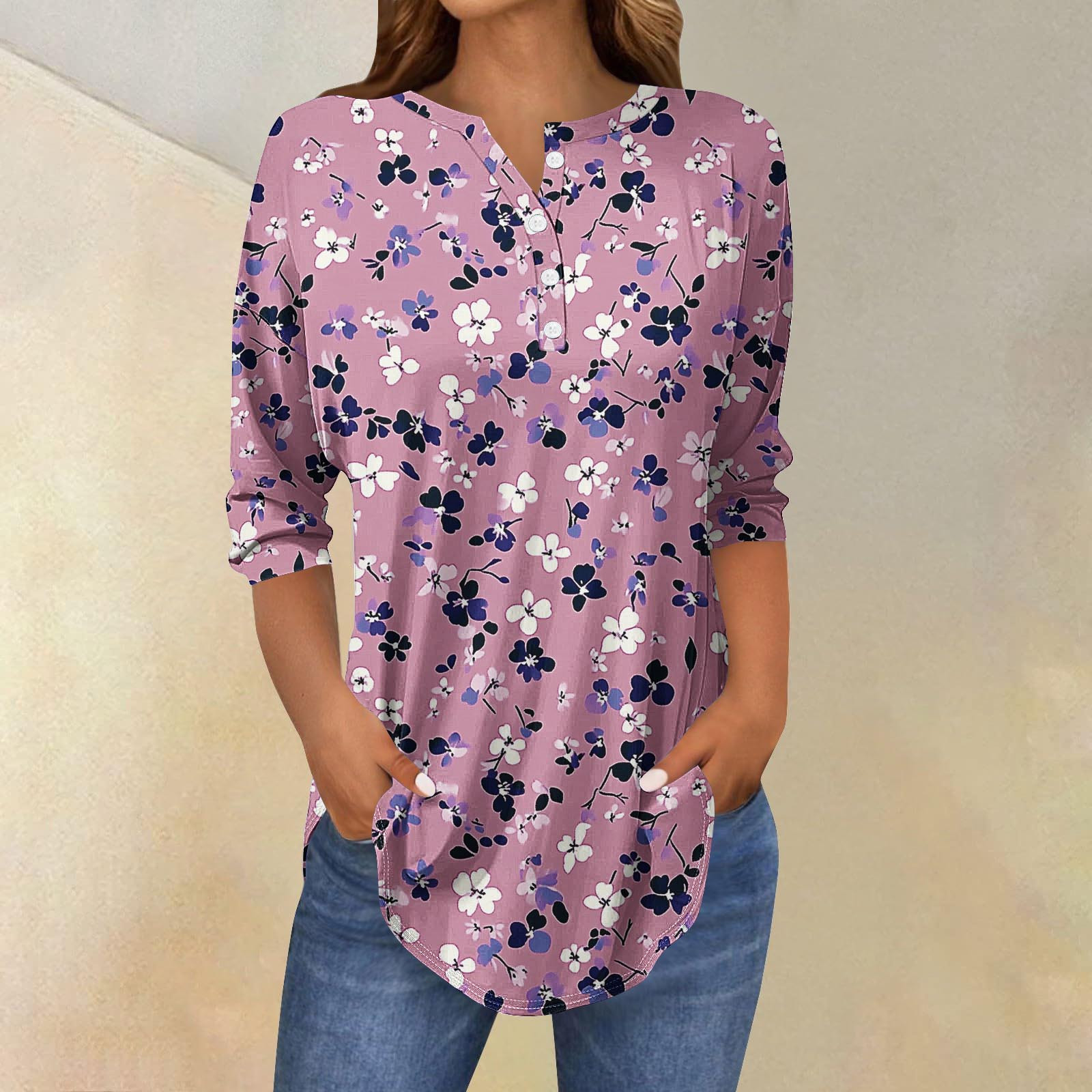Olyvenn Womens Casual Tops,Womens Tops 3/4 Sleeve Button Down Shirts V Neck Loose Casual Blouses Floral Print Tshirts Multicolor L