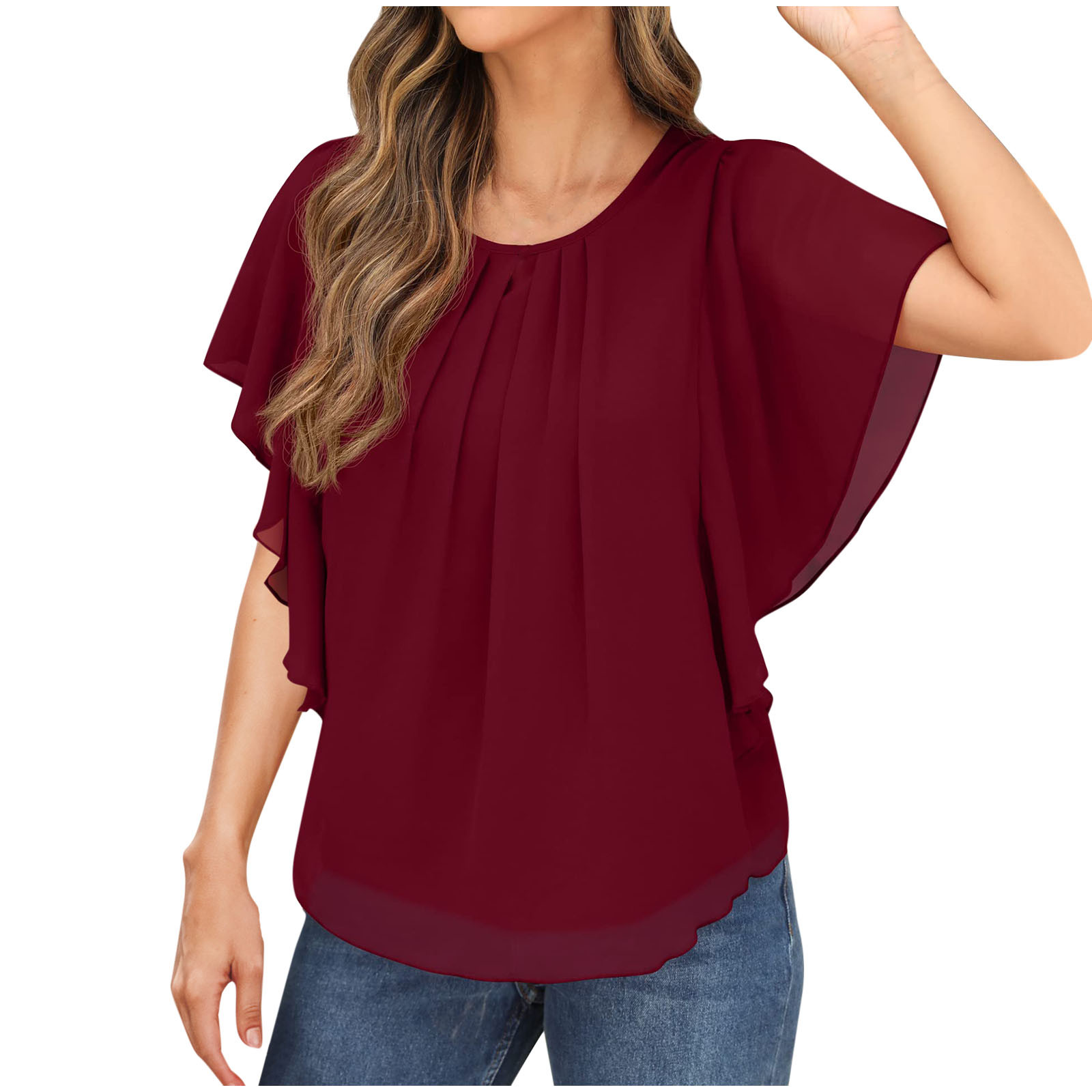 Hero image 0 of Olyvenn Womens Ruffle Short Sleeve Chiffon Tops Dressy Casual Cotton Peplum Shirts Round Neck Pleated Blouses Wine XXL, 0 of 7