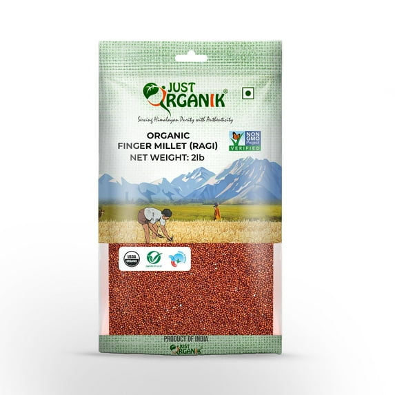 Finger millet, also known as Ragi, Nachni, Madua, etc. is one of the most nutritious millets grown in several parts of the world including India. Just Organik Ragi is sourced from the certified organic farms from the hills of Uttarakhand, where it is locally known as 'Mandua' or 'koda' and is a regular part of the daily diet. Being a millet, it is naturally gluten-free and is considered the best grain for obtaining Dietary Calcium (344mg/100g) making it highly suitable for gluten & lactose-intolerant people. Ragi is rich in many nutrients and loaded with various health related benefits. Harvested and collected from the high Himalayan hills, Just Organik Ragi (Finger Millet) is processed in a state-of-the-art processing facility in Uttarakhand.
