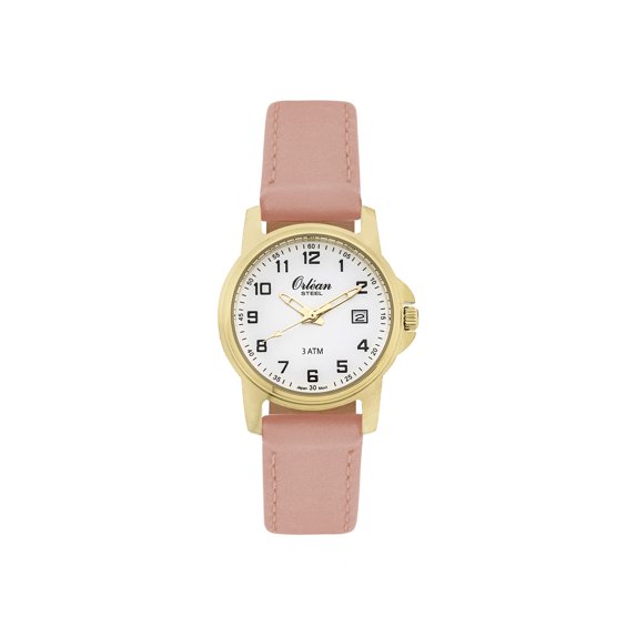 Hero image 0 of Orlean Womens Easy to Read Watch with Date - 316L Stainless Steel Case, Leather Watch Band - 27mm Analog Ladie's Wrist Watches - White Dial, Big Easy Read Numbers - Gold / Light Pink Band, 0 of 4