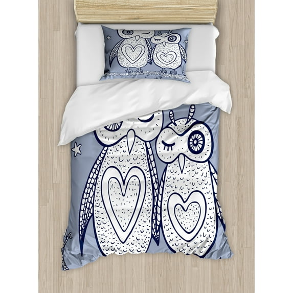 Hero image 0 of Owl Print Duvet Cover Set Twin Size, Doodle Style Graphic of Cute Night Bird Couple on Branch, Decorative 2 Piece Bedding Set with 1 Pillow Sham, Dark Violet Blue Ceil Blue White, by Ambesonne, 0 of 3