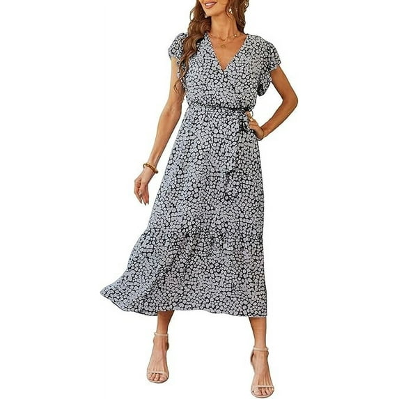 PRETTYGARDEN Women's Floral Boho Dress Wear To Work Wrap V Neck Short Sleeve Belted Ruffle Hem A-Line Flowy Maxi Dresses