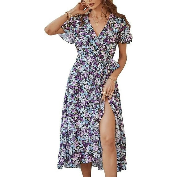 Hero image 0 of PRETTYGARDEN Women's Floral Boho Dress Wear To Work Wrap V Neck Short Sleeve Belted Ruffle Hem A-Line Flowy Maxi Dresses, 0 of 7
