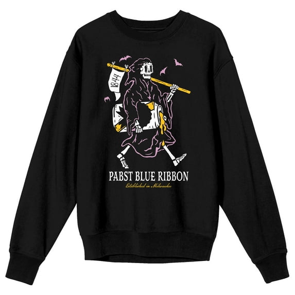 - CUSTOM DESIGNED: Featuring a big, bold graphic of the Grim Reaper enjoying a PBR, this aptly black crew neck sweatshirt makes a perfect addition to the wardrobe of any Pabst Blue Ribbon fan!