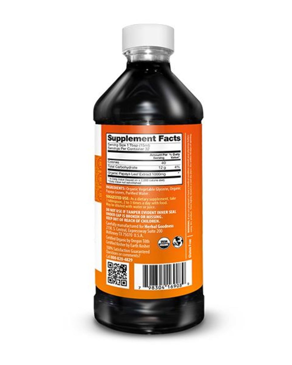 Papaya Leaf Extract Liquid from Herbal Goodness is a powerful, organic supplement designed to support blood platelet health, digestive function, gut health, and overall well-being. This 16oz bottle contains pure, high-quality papaya leaf extract, providing a natural way to enhance your body’s wellness. Known for its rich content of papain, a natural digestive enzyme, this extract is an excellent addition to your health regimen. The papaya leaves, carefully harvested and processed to retain their potent properties, are packed with essential nutrients that may contribute to optimal gut health. The presence of papain in the extract supports the body’s digestive enzymes, aiding in the breakdown of proteins and promoting better digestion. This liquid extract is an excellent option for individuals looking to support their digestive health naturally while maintaining the health of their spleen and boosting blood platelet levels. Organic Papaya Leaf Extract is a holistic supplement with a wide range of benefits. Papaya juice from the leaves is traditionally used for its ability to support digestive function, nourish the spleen, and promote overall gut health. The supplement’s natural composition helps to maintain a balanced digestive system, while also offering a gentle boost to the body’s blood platelet levels. This makes it an ideal choice for those looking to enhance their health naturally. This supplement is made with organic ingredients, ensuring that you receive a safe and chemical-free product. Free from artificial additives or preservatives, the Papaya Leaf Extract Liquid is a clean, natural option for supporting your health and wellness.