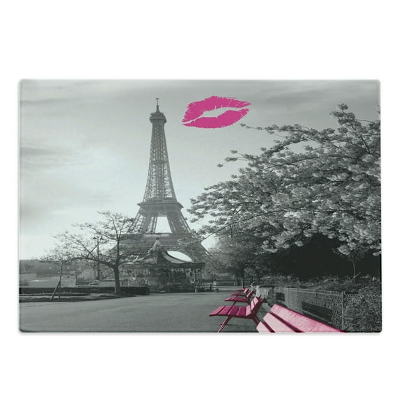 Hero image 0 of Paris Cutting Board, Romantic Monochrome Photo of Eiffel Tower Pink Benches and a Kiss Mark, Decorative Tempered Glass Cutting and Serving Board, Large Size, Black White Hot Pink, by Ambesonne, 0 of 1