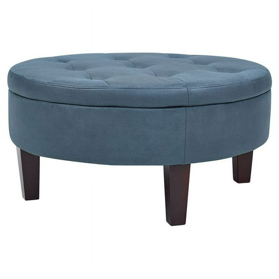 Bring style and comfort to any room with this round tufted top ottoman. Featuring lift-off lid storage ideal for clean look and easy storage access. This product is made from soft faux leather upholstery in the color blue. Enhanced by its tall legs, can be used as extra seating or footrest for comfort.