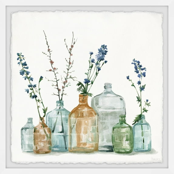 A gorgeous still life of various flora in shining, colored glass bottles. This demure yet captivating piece would be a beautiful addition to any living area. This piece is printed on high quality archive paper and professionally hand-framed. With wall-mounting hooks included, this artful accent is ready to hang up as soon as it reaches your front door.