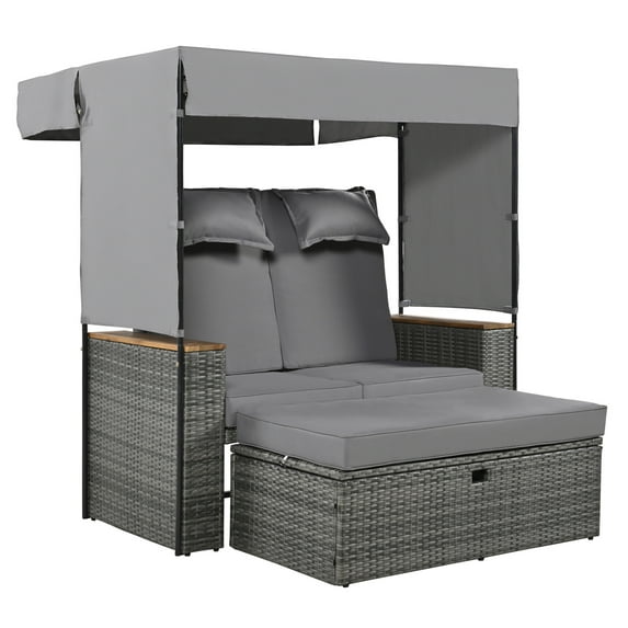 Hero image 0 of Patio Rattan Daybed with Canopy, Outdoor Double Chaise Lounge with Adjustable Backrest & Storage Ottoman, UV Protection & Waterproof, Patio Sunbed Lounge Chair for Garden Backyard Porch, Gray, 0 of 9