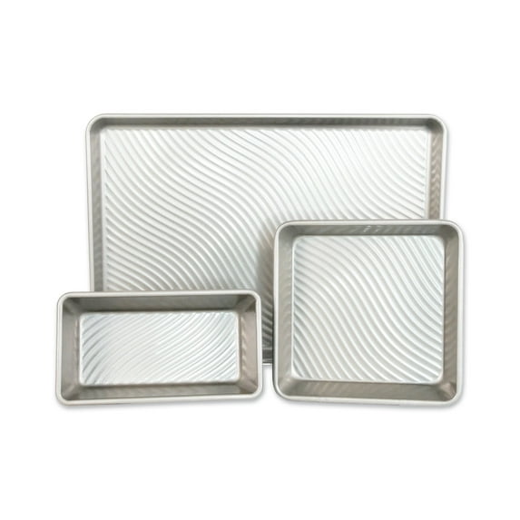 Step into the realm of baking excellence with the Patriot Line by USA Pan, featuring our 3-piece baking essentials set. Discover why our baking pans are beloved in both commercial and home kitchens. This set includes a half sheet pan, an 8-inch square cake pan, and a small loaf pan—perfect for a wide range of baking and roasting needs. Made from aluminized steel, our pans ensure even heat distribution and durability for all your baking needs. The corrugated design enhances air circulation and provides extra warp resistance. Plus, our superior nonstick coating ensures effortless food release and easy cleanup. Upgrade your kitchen or delight a new homeowner with this timeless bakeware set today.