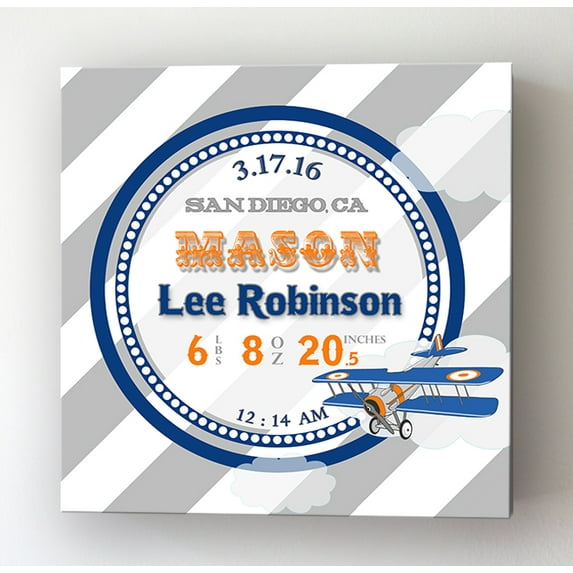 Personalized Canvas Birth Announcement Nursery Decor Gift, Airplane Design, Custom Name, Date, Weight & Length, Unique Boys & Girls Baby Shower Wall Art Presents, Color Gray # 1 , Size - 10x10